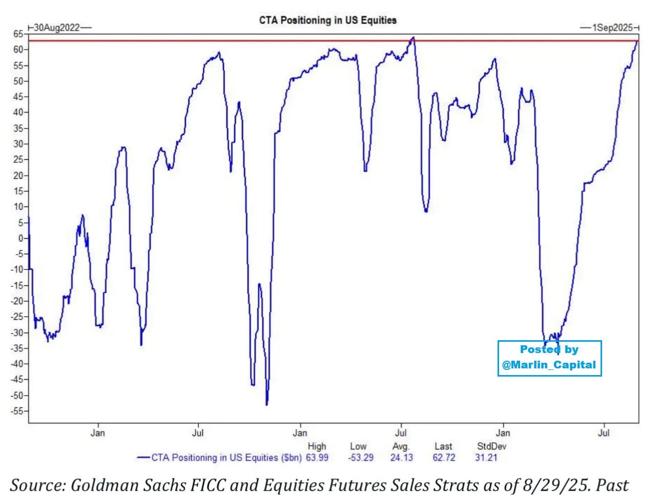 De CTA-positionering in Amerikaanse aandelen staat per 1 september 2025 op het 100ste percentiel en is maximaal long.