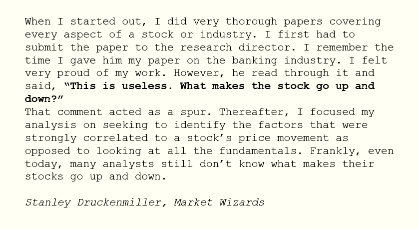 Wat zorgt ervoor dat een aandeel stijgt of daalt. De wijze les van Stanley Druckenmiller, één van de meest succesvolle beleggers ooit en één van de methodes die we ook bij scetrader.nl toepassen is dat het niet draait om het gebruiken van alle details en cijfers van een bedrijf (asset).