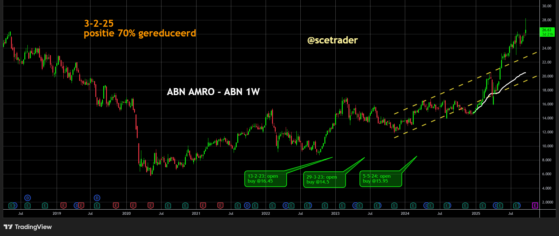 ABN AMRO shares jumped intraday by roughly 10 percent on the takeover rumors but ended the day more than 3 percent higher. KBC’s stock closed nearly 1 percent lower. Whether a concrete bid materializes remains uncertain, but the market has once again shown that ABN AMRO is on the radar of potential buyers. This works in favor of our established position.