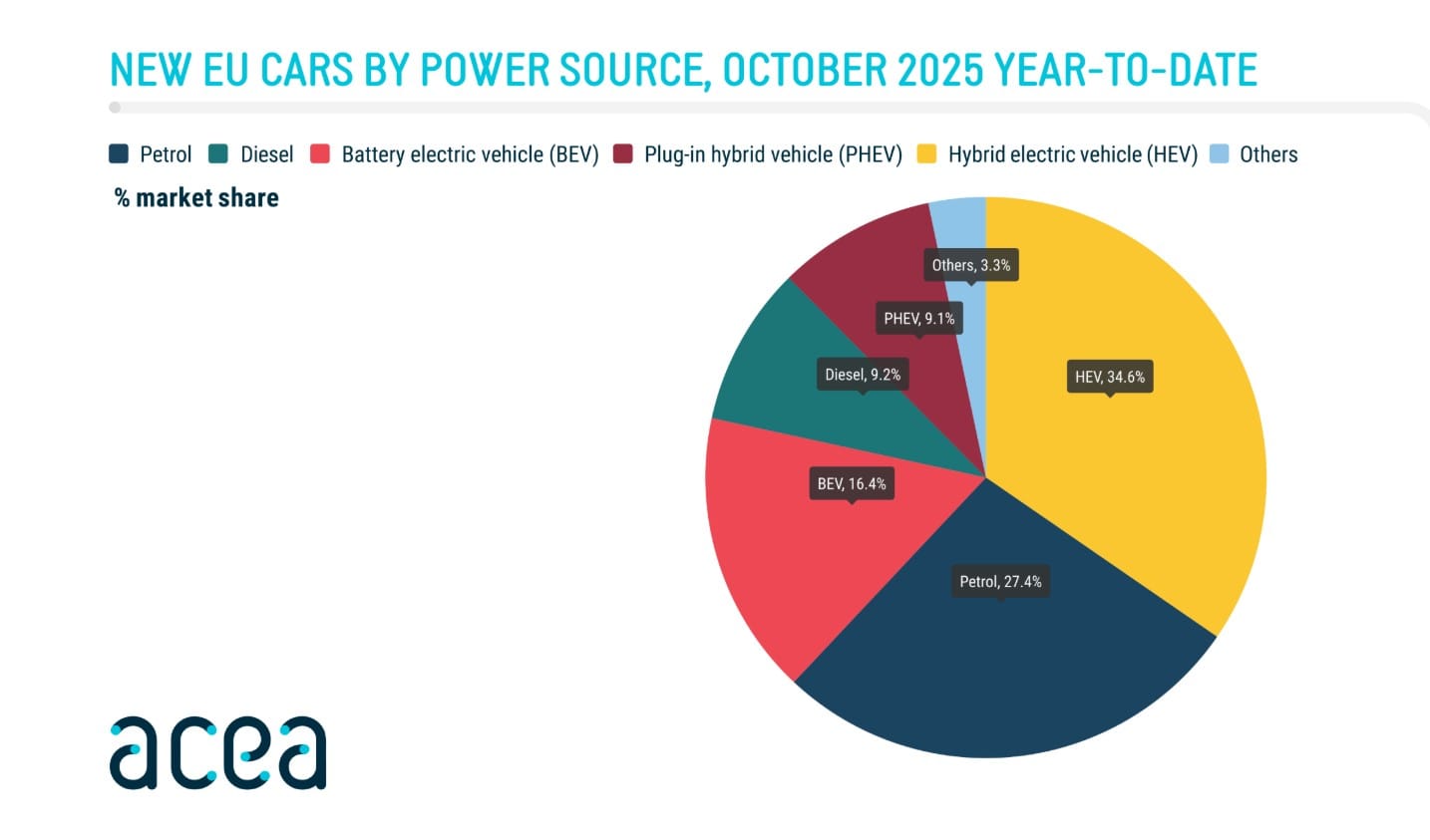 The European automotive market recorded another month of modest growth in October 2025. Year-to-date registrations increased by 1.4 percent, marking the fourth consecutive month of improvement. Despite this uptick, total volumes remain well below pre-pandemic levels. The shift toward hybrid and fully electric powertrains continues, although not at a pace that resolves the sector’s underlying weaknesses.