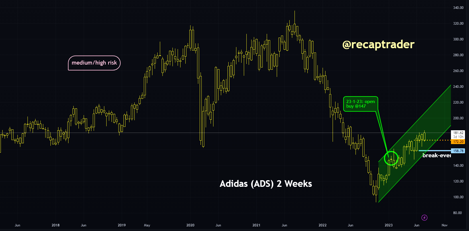 In januari zijn we op een stijging gaan zitten van Adidas. Die up is nog steeds intact, maar wel met een stop flink in de winst. Op basis van prijs gedreven actie moet gezegd worden dat het aandeel zeker in een stijgend trendkanaal zit.