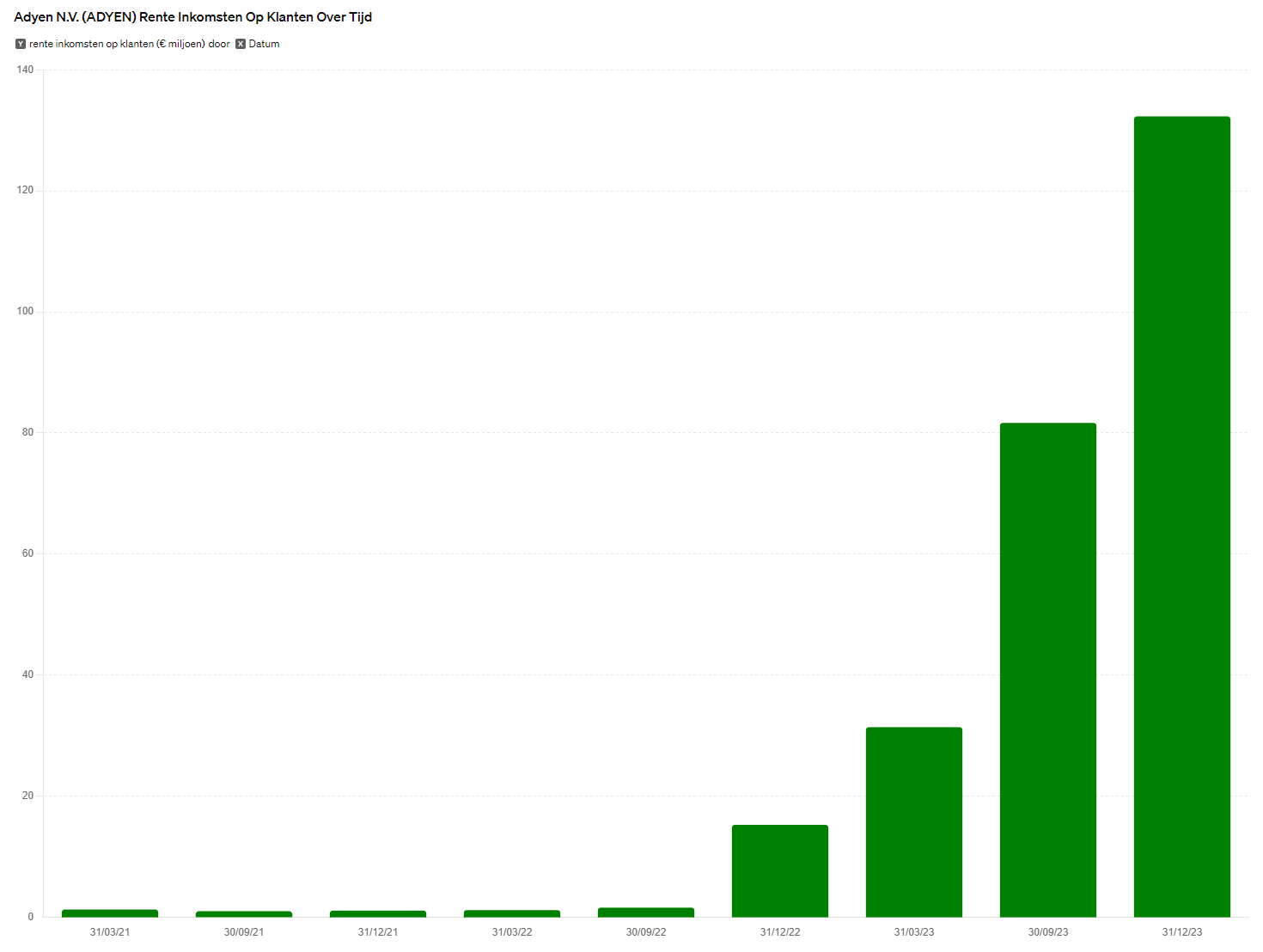 De rentebaten van klantengeld bij Adyen $ADYEN laten een aanzienlijke stijging zien in de afgelopen jaren. Deze zijn gestegen €1,28 miljoen in maart 2021 naar €272,03 miljoen op 31 december 2023. Deze extra inkomsten kunnen een buffer vormen voor het bedrijf, maar veranderen onze visie op het aandeel momenteel niet.