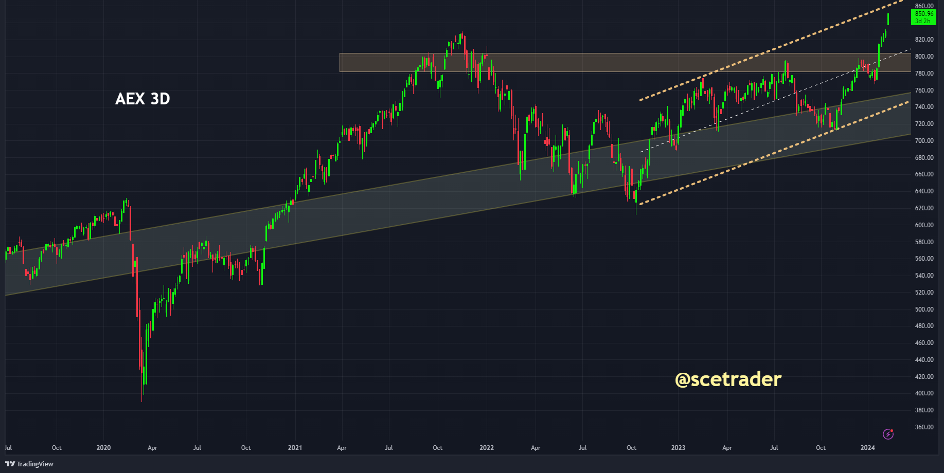 Echter, we zien tegelijkertijd dat de AEX-index nog altijd binnen haar opwaartse range zit. Dit houdt in dat het nu zelfs mogelijk is voordat er een correctie plaatsvindt de koersen nog verder naar boven gaan.