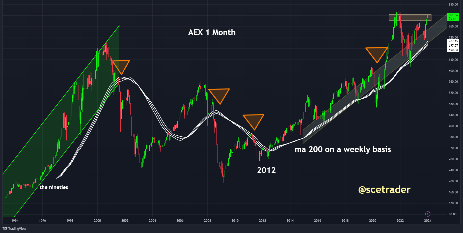 Het eerste niveau waar we dan naartoe gaan is 840. Dan zal moeten blijken of er daadwerkelijk een langdurige bullish marktbeweging plaatsvindt, zoals ook zichtbaar was in de jaren negentig.