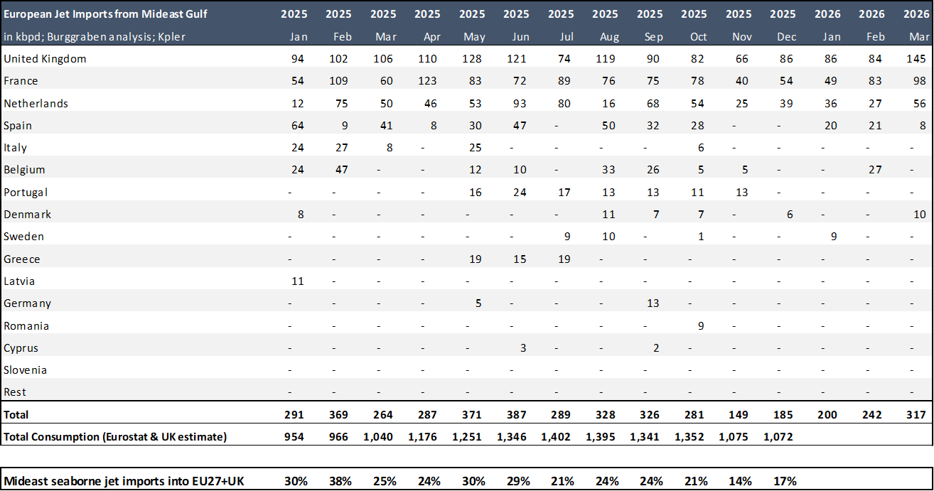 De drie grootste importeurs van jet fuel uit de Golf zijn het Verenigd Koninkrijk, Frankrijk en Nederland, met piekniveaus van respectievelijk 145 kbpd, 123 kbpd en 93 kbpd. De Rode Zee vormt de kritieke doorvoerroute voor al deze volumes.