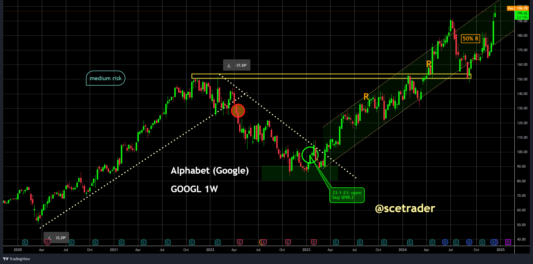 Bij Alphabet $GOOGL zitten we op een stijging vanaf 98,2 dollar. We hadden ook graag dit aandeel opgenomen in de Free Ride Portfolio, maar hebben te lang gewacht met lopen drentelen. Nu moeten we afwachten of alsnog het risico nemen om rond de top in te stappen. Wel gaan we ervan uit dat de koers van Alphabet over een langere periode veel verder kan stijgen.
