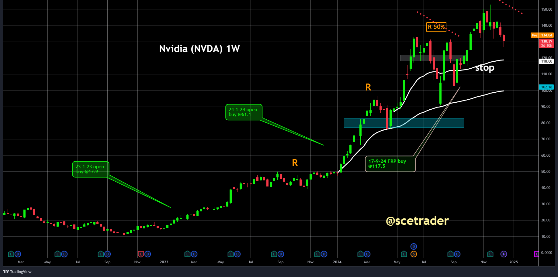 Echter, de lange termijn outlook blijft sterk met een almaar groeiende markt. Daardoor blijven we op een stijging zitten, maar realiseren we ons dat we op de korte termijn niet zeker zijn of NVIDIA nog verder zal dalen.