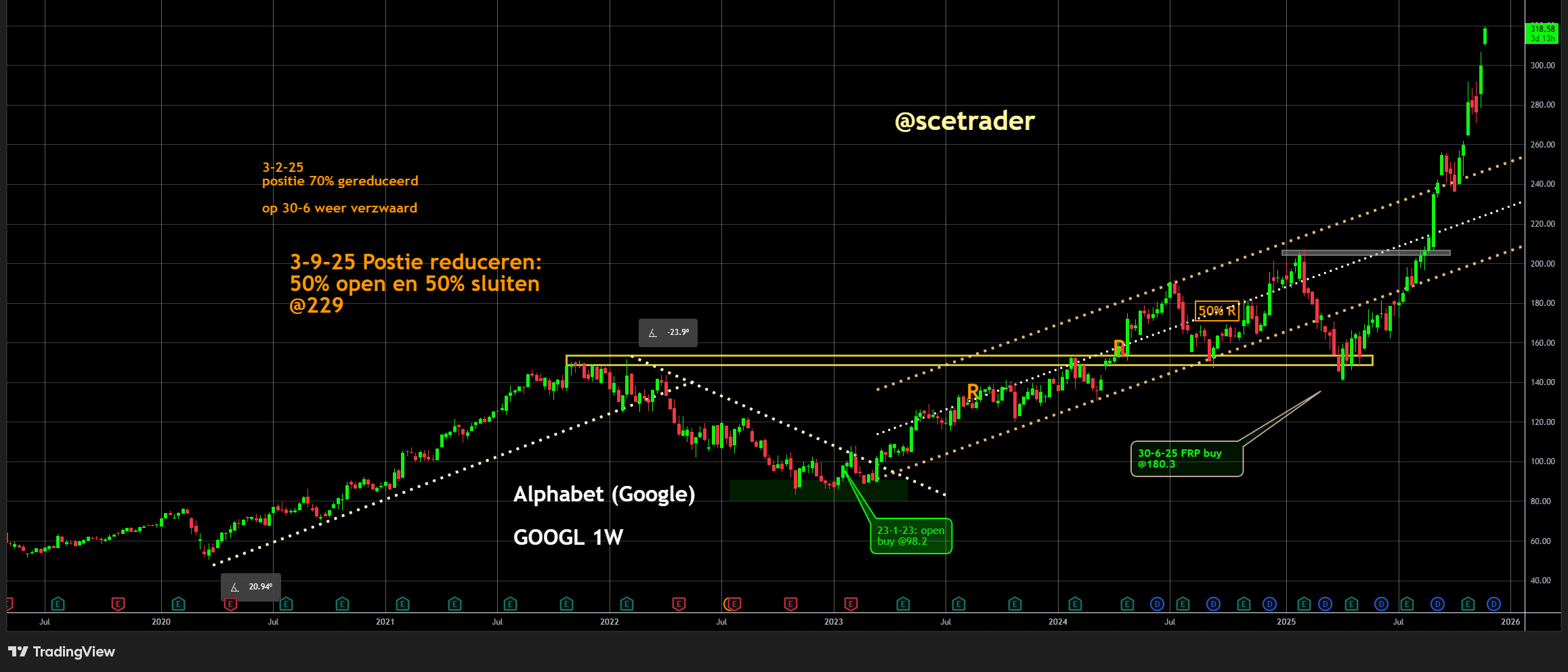 We zitten op een stijging van het aandeel Alphabet, dat na de krachtige rally van de afgelopen tijd feitelijk als een free ride kan worden beschouwd. Nieuwe posities nemen we nu niet, omdat de stijging te fors is om op deze niveaus posities uit te breiden. Dat doen wij uitsluitend op correcties. Dat gezegd hebbende is dit nieuws bullish voor de lange trend, omdat een potentiële deal met Meta de vraag naar Google’s AI-hardware fundamenteel kan versterken.