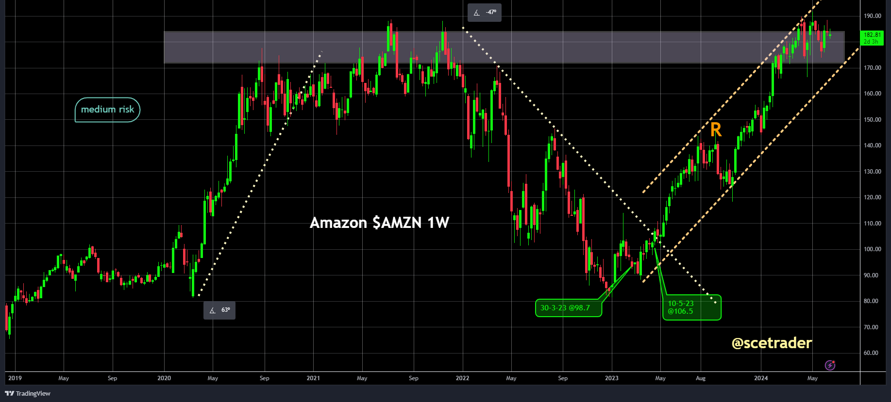 Sinds maart 2023 vanaf $98,7 zitten wij op een stijging van het aandeel Amazon. De stijging is te danken aan verschillende factoren: Amazon heeft consistente omzet- en winstgroei laten zien, aangedreven door sterke prestaties van AWS en e-commerce met een positieve outook.