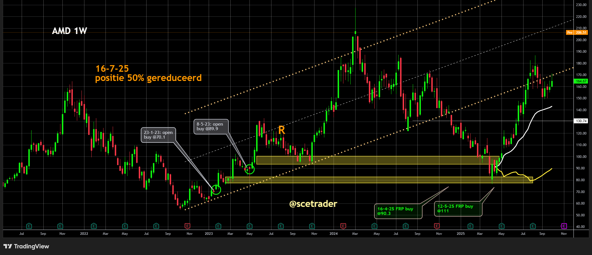 Wij blijven bullish op AMD en zitten al op een stijging. De samenwerking met OpenAI bevestigt onze visie dat AMD structureel marktaandeel zal winnen in de AI-chipmarkt. Elke correctie zien wij als een kans om posities verder uit te bouwen.
