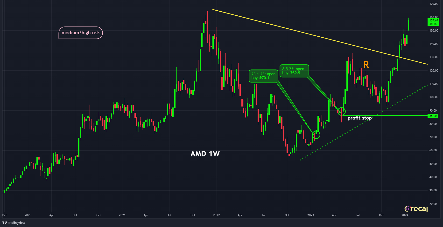 Wij zijn in januari 2023 ingestapt in $AMD op $70,1 dollar. De positie is vervolgens in de winst iets verminderd en er is een stop-loss ingelegd op ons initiële investeringsniveau zodat er een free ride is gecreëerd.