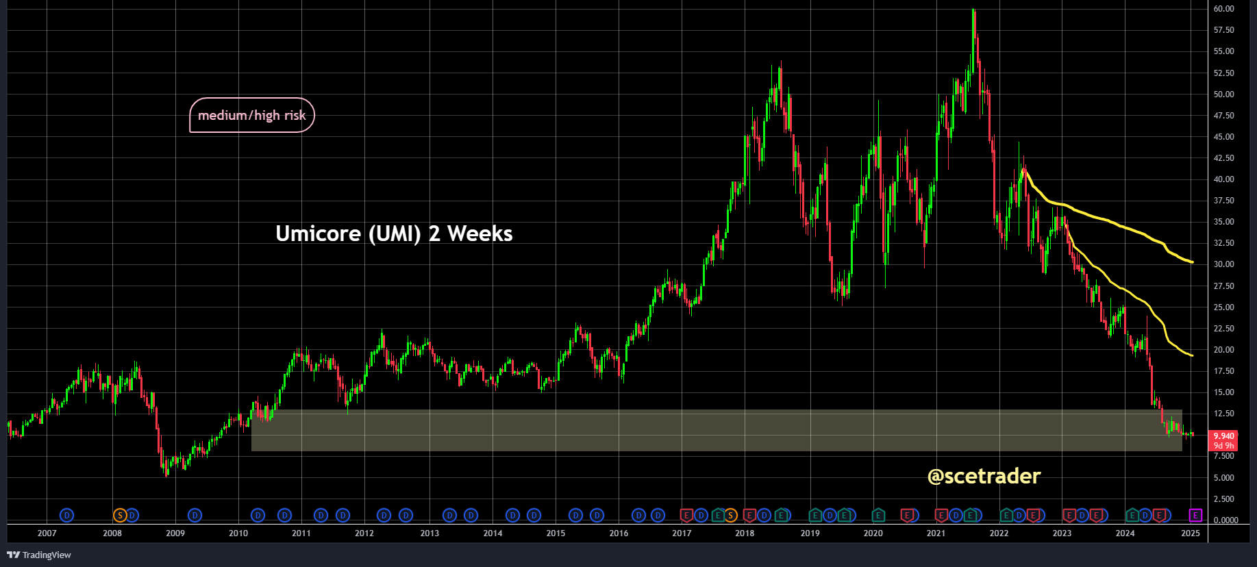 Ook bij Umicore zien we een vergelijkbaar patroon. Hoewel het aandeel rond een steunpunt handelt, blijven de onderliggende problemen groot.