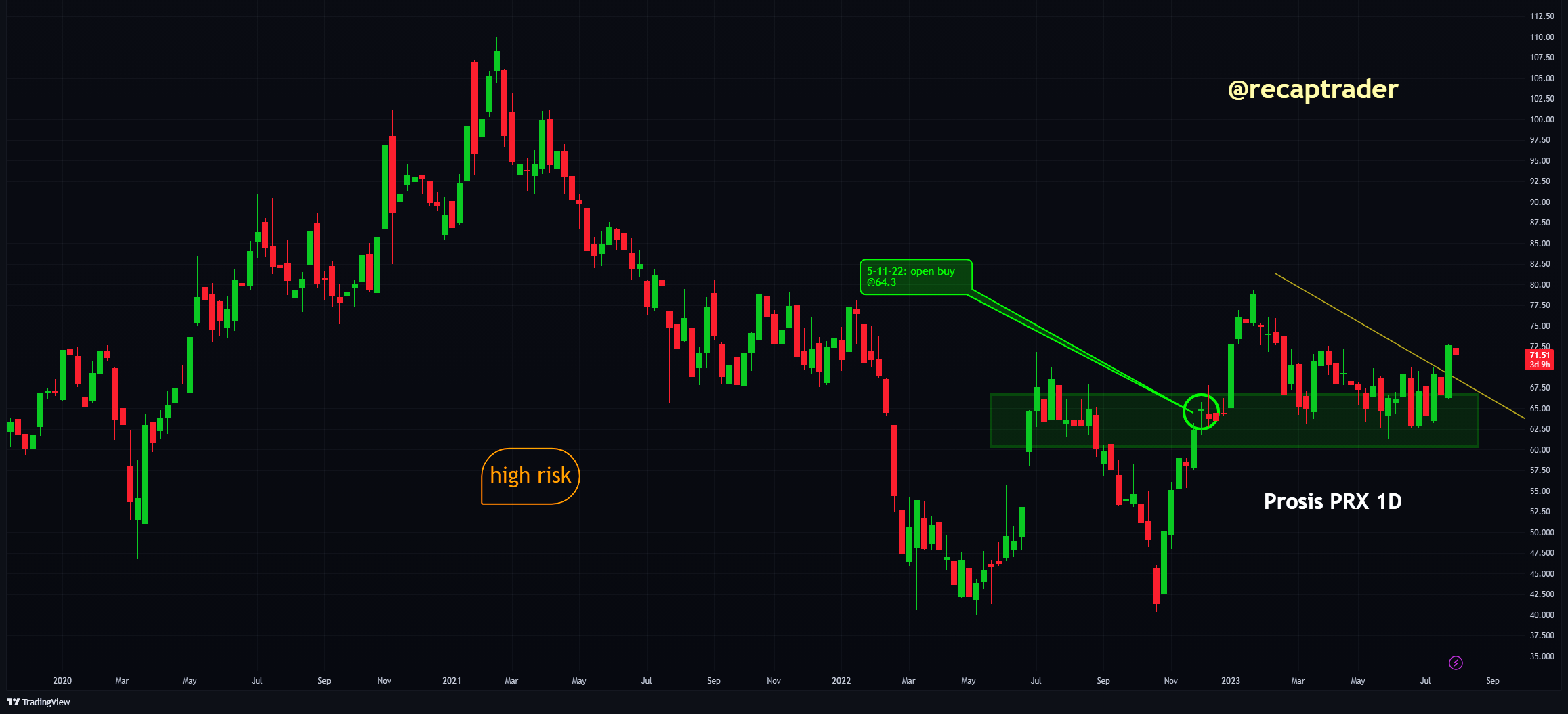 Het aandeel Prosus $PRX heeft onlangs een mooie upswing laten zien. Deze beweging is sterker dan we hadden "gehoopt", maar komt prima uit. We zitten al op een stijging en eventuele zwakte wordt gezien als een mooie kans om bij te kopen. Immers, het belang in Tencent wordt op geen enkele wijze weerspiegeld in de beurswaarde van Prosus (zie ook eerdere berichten).