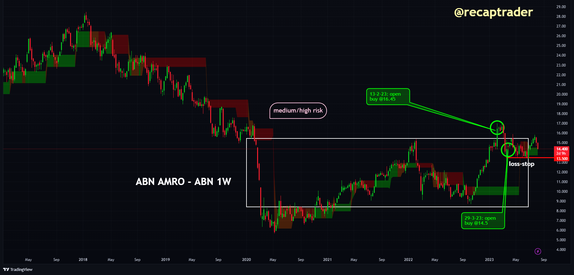 De koers van ABN AMRO $ABN is na de cijfers gedaald. Hoewel het koerspatroon onduidelijk is, wordt de kans niet uitgesloten dat een herstel in de komende maanden zal plaatsvinden. De cijfers waren redelijk en het aandeel is relatief goedkoop. We blijven bullish.