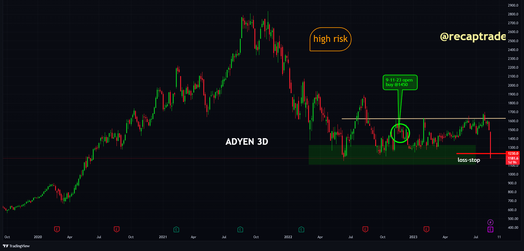 De resultaten van Adyen $ADYEN zijn slechter dan verwacht. Waarschijnlijk zullen taxaties en groeiprognoses door de markt naar beneden worden bijgesteld. We zitten met een gereduceerde positie op een stijging. Zoals eerder aangegeven zouden we niet bijkopen. En ondanks de dip vandaag van ruim 20% hebben we zelfs besloten om naar neutraal te gaan. We stoppen het bloeden en nemen afscheid van Adyen.