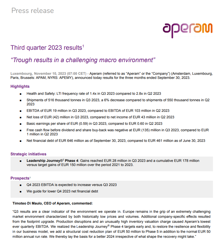 Timoteo Di Maulo, CEO van Aperam, benadrukte dat de resultaten van het derde kwartaal de uitdagende zakelijke omgeving weerspiegelen, met Europa dat te maken heeft met historisch lage prijzen en volumes.