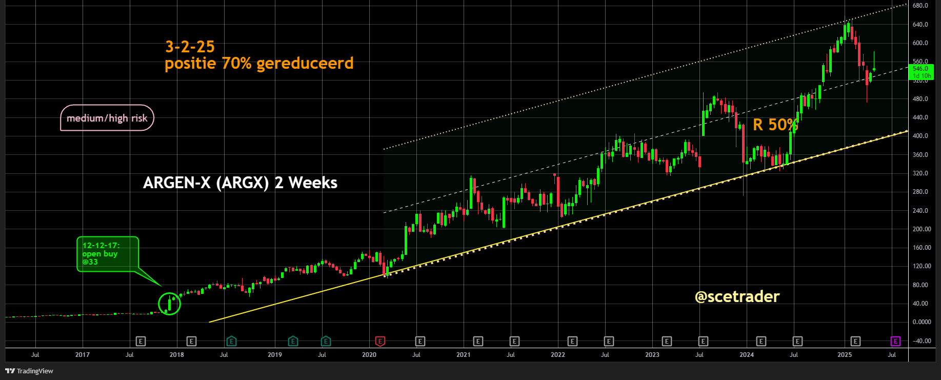 We zitten al sinds 2017 op een stijging van het aandeel Argenx (zie ook database). Wat begon als een veelbelovend biotechbedrijf is uitgegroeid tot een winstgevende onderneming, die in het eerste kwartaal van 2025 voor het eerst zwarte cijfers schreef.