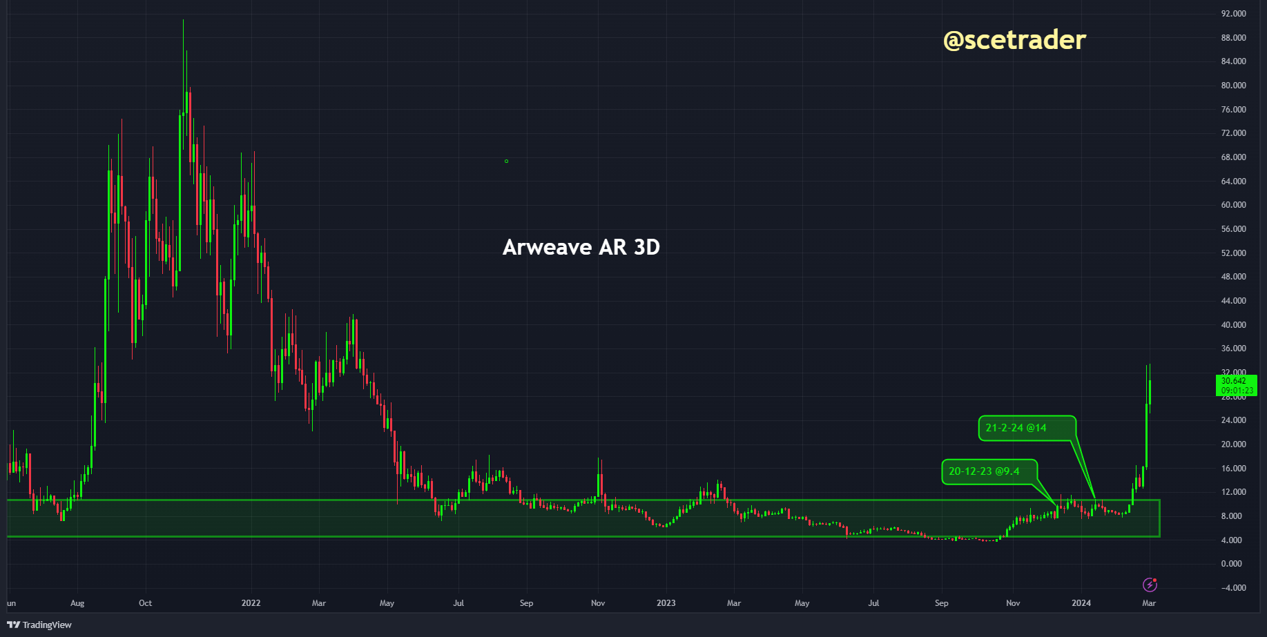 De koers van Arweave $AR zet de rally voort. Wij zitten op een up in Arweave vanaf $9,40. De rally heeft (ondermeer) te maken met het feit dat er nu meer dan 1,2 miljoen berichten succesvol zijn verzonden op het AO testnet. Dit succes leidt ertoe dat de koers van Arweave "los is" en misschien wel verder stijgt.