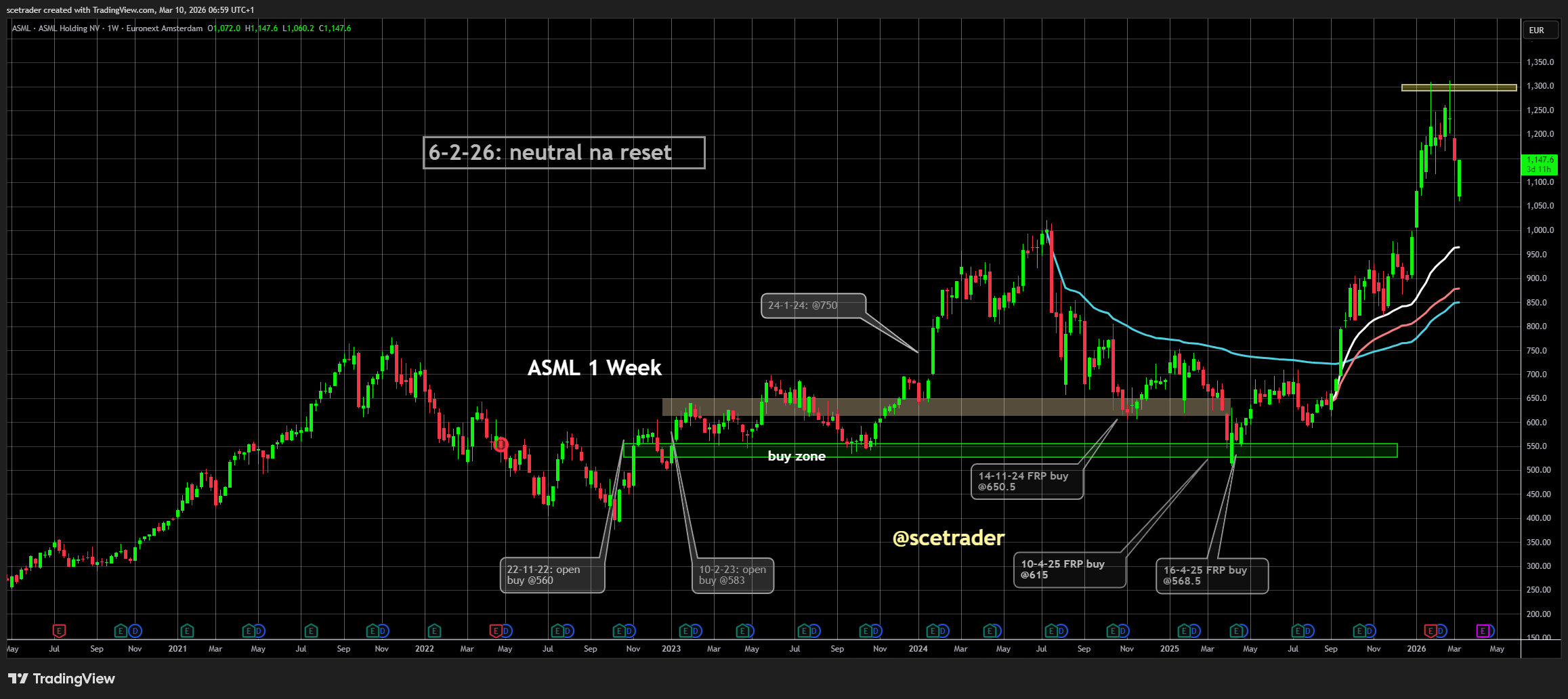 Wanneer we naar de chart van ASML kijken, zien we dat het aandeel een duidelijke top heeft gevormd rond het niveau van 1300 euro. Technisch gezien lijkt het zelfs te gaan om een dubbele top, waarna de koers duidelijk terrein heeft verloren.