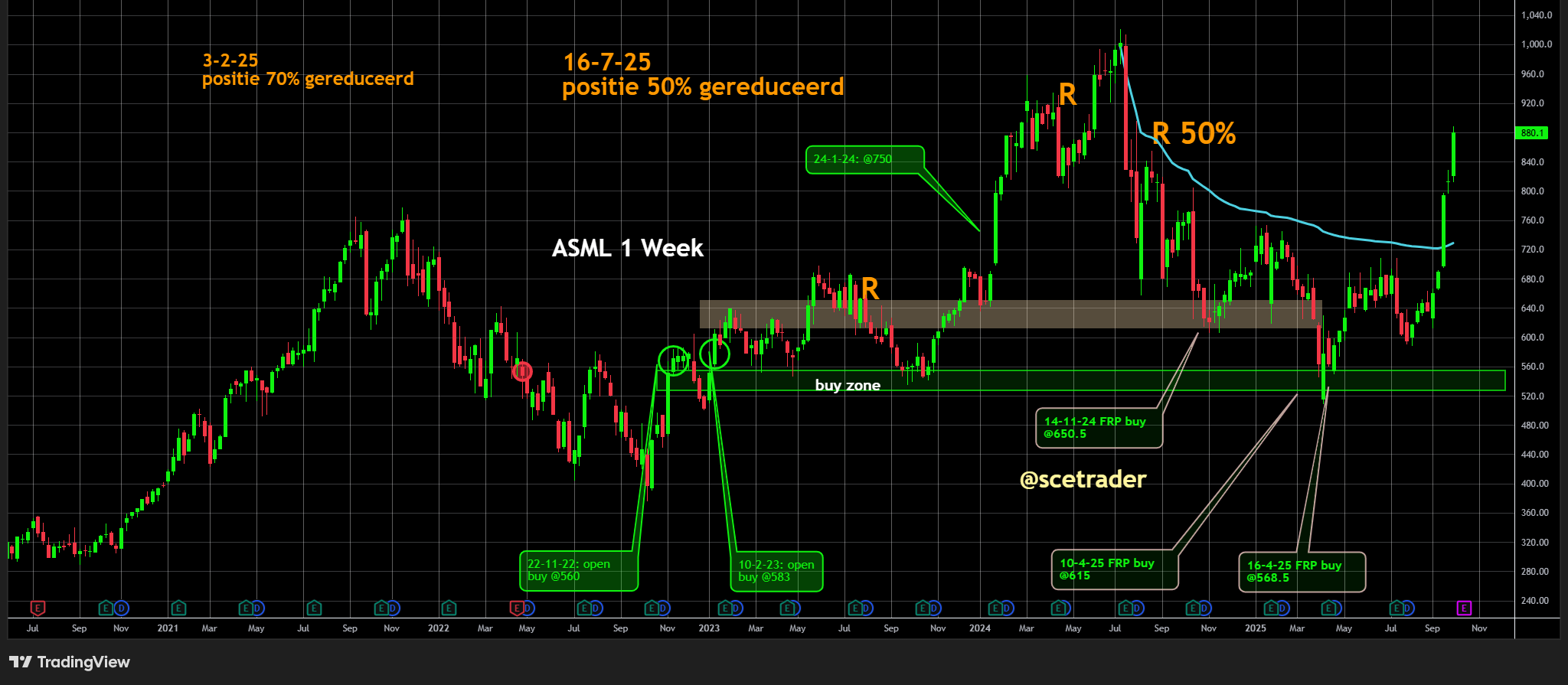Wij zitten op een stijging van het aandeel ASML. We kopen momenteel niet bij, eerder al hebben we aangegeven dat de koers op termijn richting 1000 euro kan gaan.