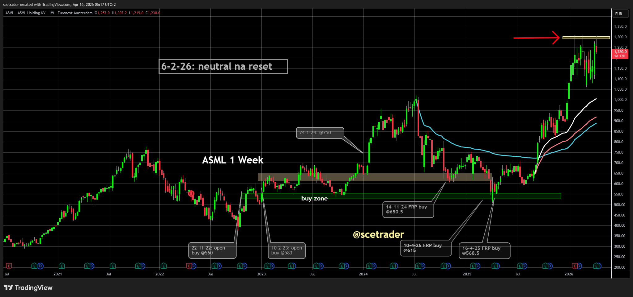 Het aandeel ASML staat vandaag opnieuw voor een cruciale test van de oude top, een niveau dat samenvalt met het record en daarmee als duidelijke weerstand fungeert.
