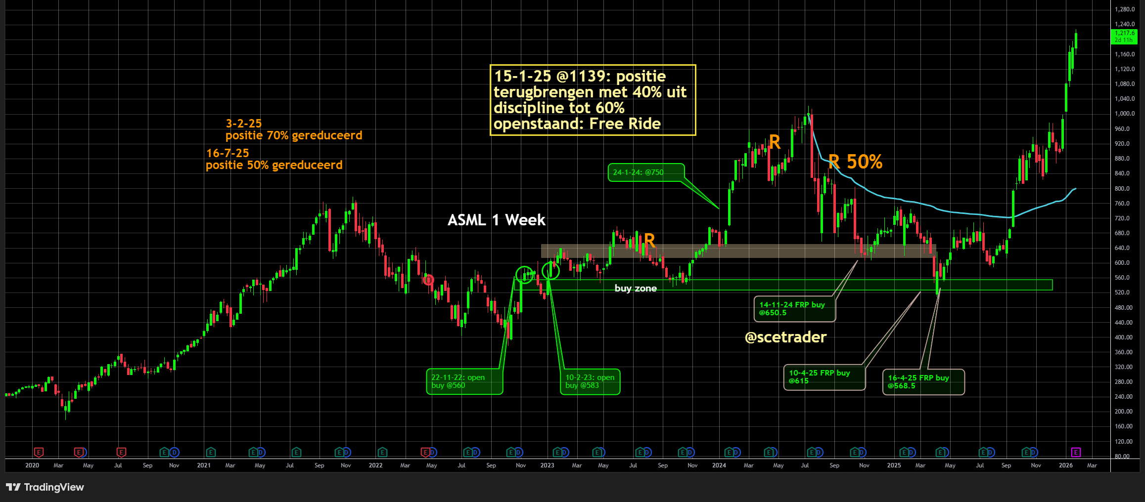 ASML laat met deze cijfers zien dat het bedrijf zich in een uitzonderlijk sterke fase bevindt. Recordorders, verhoogde omzetverwachtingen en een fors aandeleninkoopprogramma versterken elkaar en zorgen voor toenemende zichtbaarheid richting 2026. Wij blijven positief en blijven zitten op een stijging, waarbij de huidige positie als free ride ruimte biedt om de verdere opwaartse trend rustig uit te zitten.