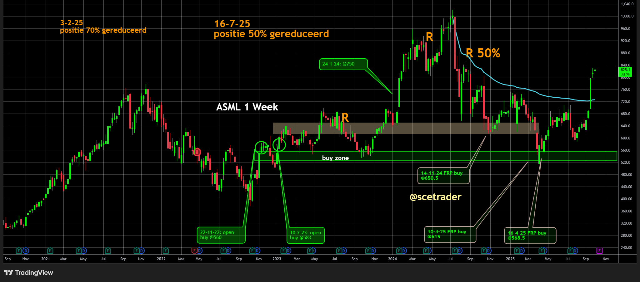 Wij zien de koersontwikkeling van ASML nog steeds als overtuigend, en als het bullish momentum in de chipsector aanhoudt, zou het niet verbazen als de koers de grens van 1000 euro nadert. Zelfs bij een tijdelijke verzwakking of correctie is dit een niveau dat in de komende kwartalen bereikt kan worden.