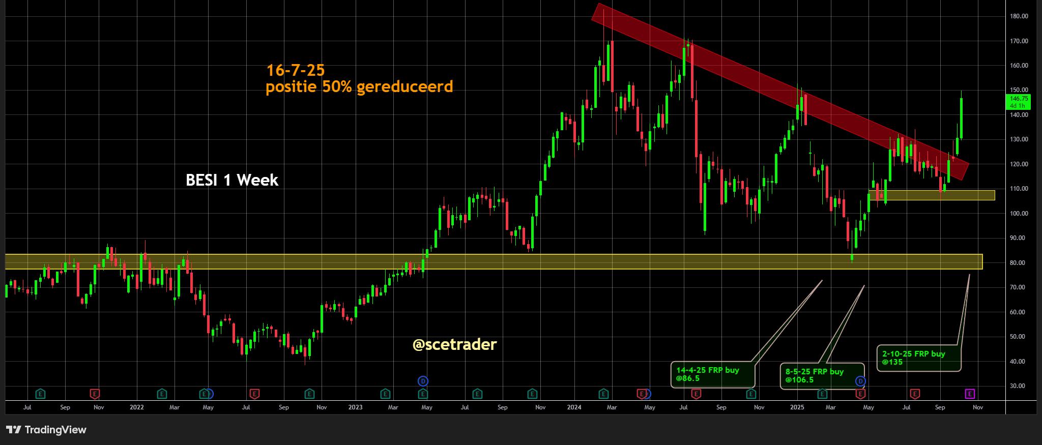 Wij blijven zitten in deze positie, want we zitten al langer op een stijging van Besi. Om het risico goed te beheren, passen we onze positie regelmatig aan. Dat betekent dat we soms verkleinen als het momentum tijdelijk afneemt en vergroten wanneer de markt opnieuw kracht toont – zoals nu.