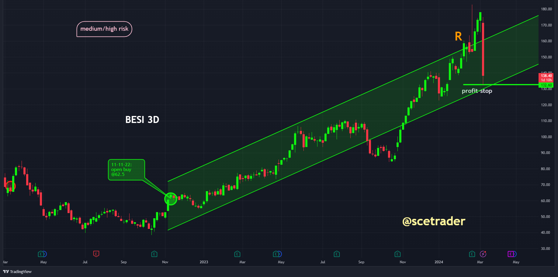De koers van Besi $BESI is alleen maar verder gedaald op vrijdag en ook weer vandaag. We hebben een stop liggen op 132 euro nadat we eerder op 62,5 euro zijn ingestapt. Mocht de stop worden gepasseerd (definitief), dan zijn we weg.