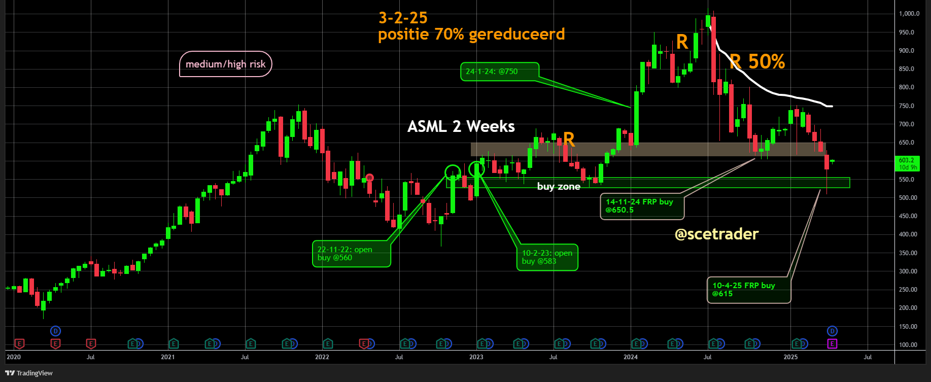ASML, waar we enkele dagen geleden alweer in zijn gestapt, stijgt eveneens met 2,5%. Zie ook de database. ASML blijft volgens ons onmisbaar in de wereldwijde halfgeleiderindustrie en bevindt zich nu in onze koopzone. Ook hier overwegen we om de positie verder uit te breiden.