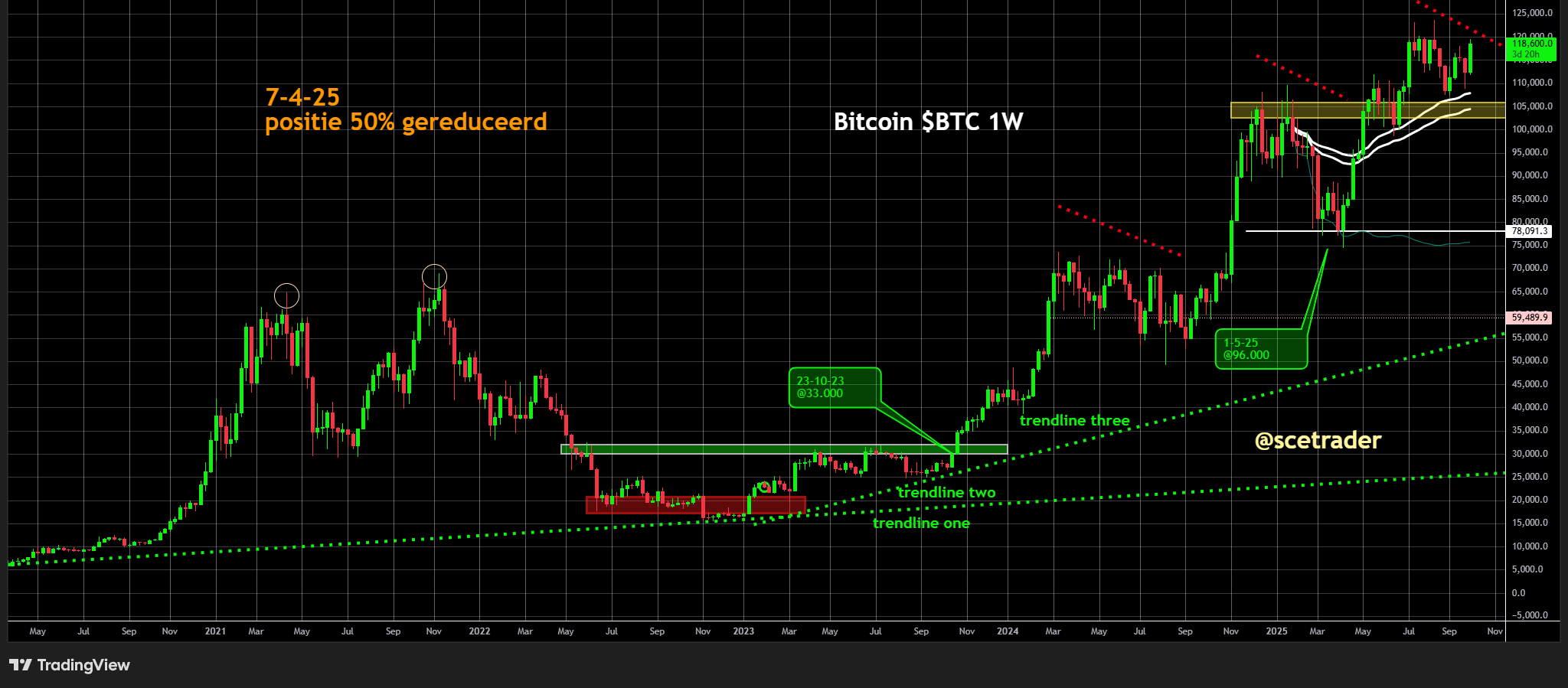 De koers van Bitcoin heeft de laatste 48 uur een sterk herstel laten zien en noteert nu rond 118.600 dollar. Daarmee nadert de munt opnieuw haar oude all-time highs. Dit herstel lijkt te worden gedragen door de combinatie van een stevige technische bodem en een opvallend sterke risicoappetite bij beleggers.