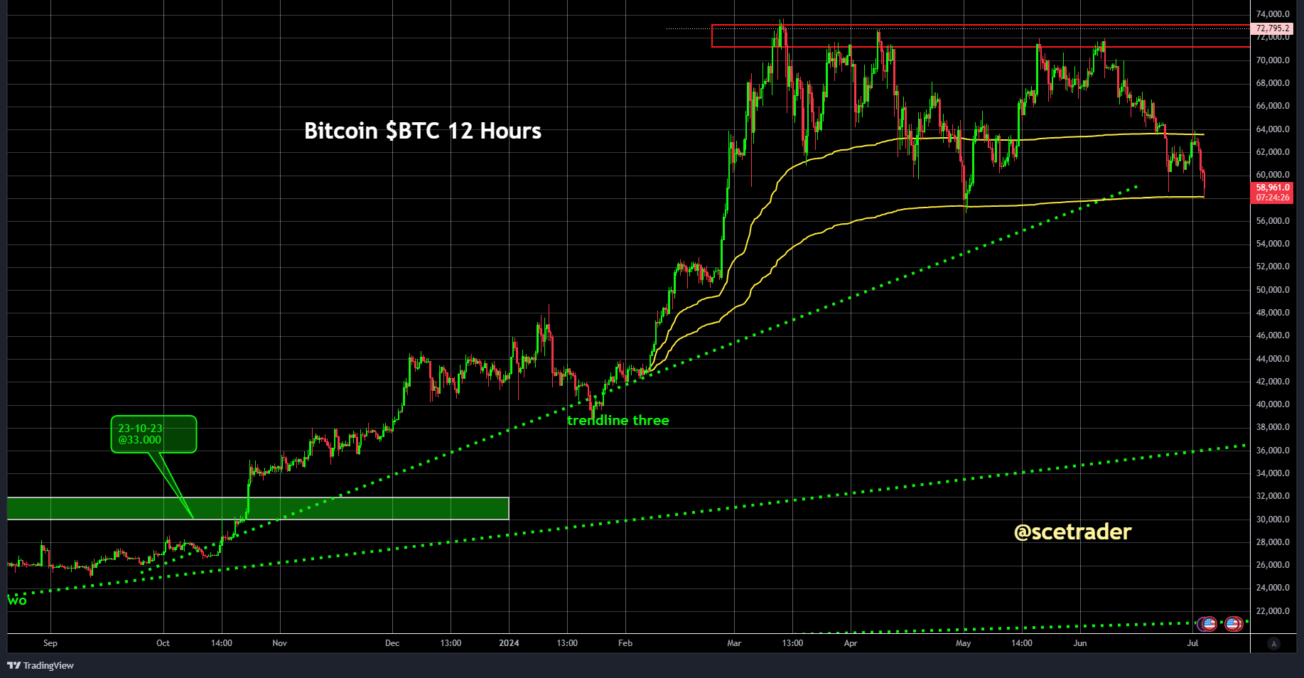 De beweging van Bitcoin geeft, volgens ons, aan dat we nog steeds voorzichtig moeten zijn. Hoewel de tweede VWAP (Volume Weighted Average Price) die we in de grafiek hebben getekend, de gele lijn, nog steeds standhoudt, ondervindt Bitcoin nog altijd weerstand op de VWAP die daarboven ligt, de andere gele lijn. Ook is het nu steeds verder verwijderd van een all-time high, wat in het verleden, zelfs terugkijkend naar 2021, een zeer sterke weerstand was.