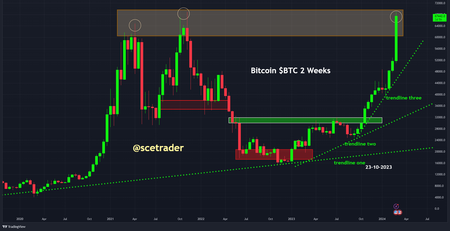 Bitcoin bevindt zich momenteel rond weerstandsniveaus, maar er is een toenemende kans op een opwaartse doorbraak. Op de lange termijn blijven de vooruitzichten positief, mede door de naderende halvering van het aanbod. De beschikbaarheid van Bitcoin ETF's op meer platforms en de interesse van bedrijven in het diversifiëren van kasreserves met Bitcoin ETF's zijn indicaties van groeiende acceptatie. Het einde van de faillissementsliquidaties van GBTC markeert een mogelijke verschuiving naar andere investeringsinstrumenten die gerelateerd zijn aan Bitcoin. Door meer toepassingen die nu misschien nog in ontwikkeling zijn, kan de vraag naar Bitcoin ook toenemen.