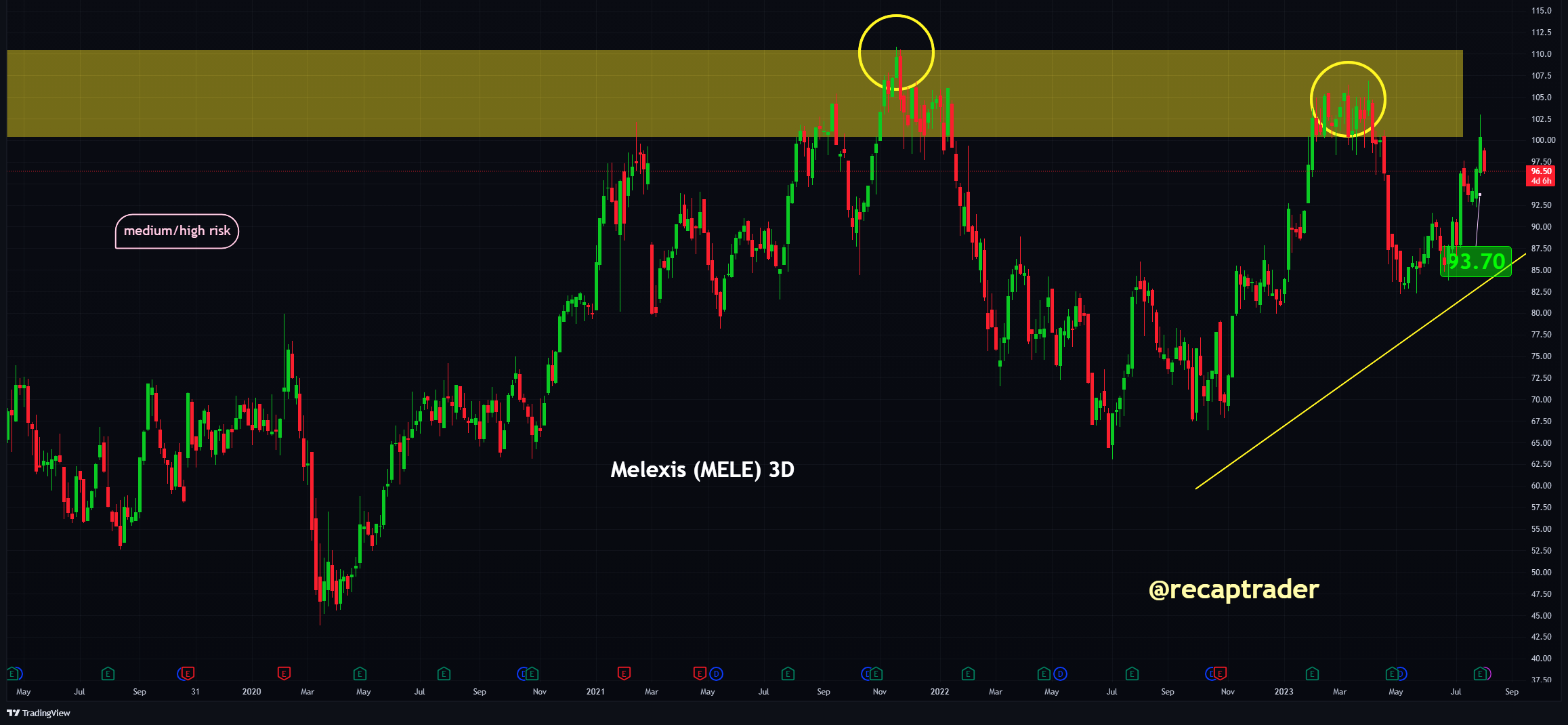 Melexis $MELE staat na de rally op de cijfers van gisteren vandaag lager. Dit komt door Infineon, die de guidance niet verhoogde. De dip in Melexis kan een goede en nieuwe tradingskans zijn, waarbij wij eerder deze week een trading buy hebben geïnitieerd op 93,7 euro.