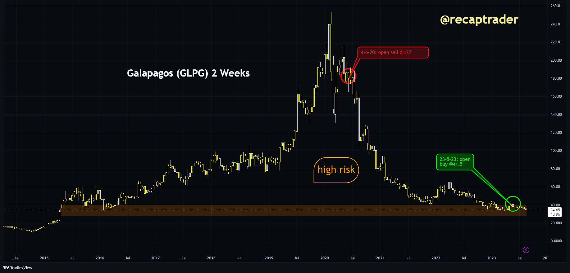 De koers van Galapgos $GLPG is ondertussen nog verder weggezakt. Onlangs kwam het biotechbedrijf met zeer zwakke cijfers en een sombere outlook. Zoals reeds aangegeven zitten we sinds enige maanden op een up die wordt omschreven als hoog risico.