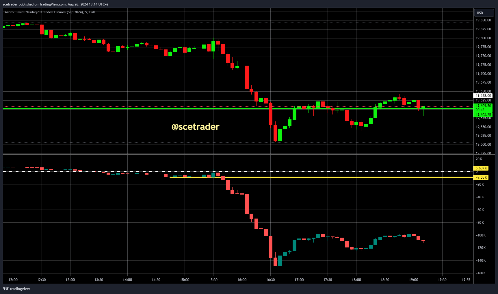 We zijn long gegaan in 2 Micro Nasdaq futures op 19589, waarbij 1 future is verkocht op 19625 en de andere op 19600. Dit leverde 94 dollar voor deze trade. Inclusief de eerste transacties van vandaag staat het totaal sinds de start op vrijdag 23 augustus van dit experiment op 854,25 dollar winst.