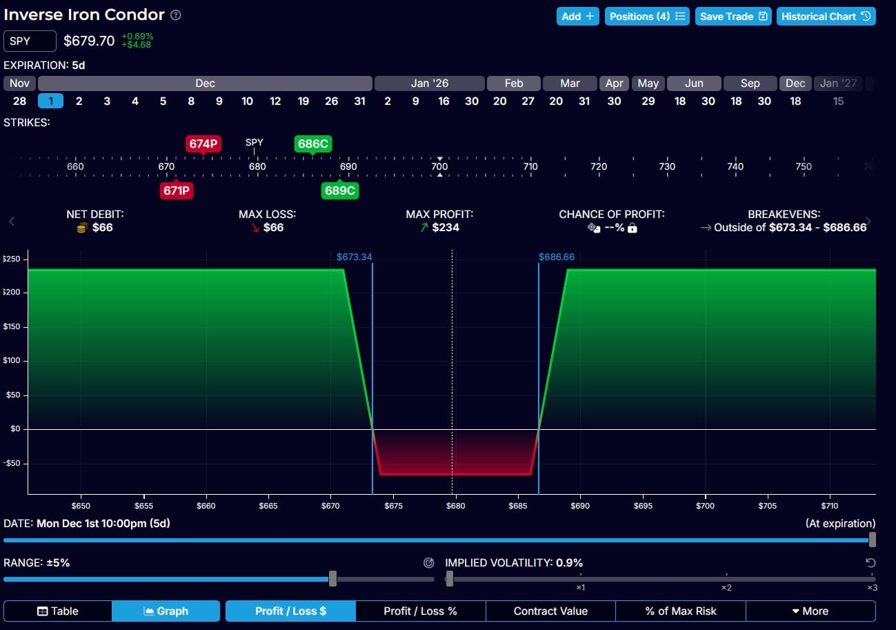 For now, the example below illustrates an Inverse Iron Condor that I am considering for tomorrow. This example is purely illustrative and fully separate from all other content.