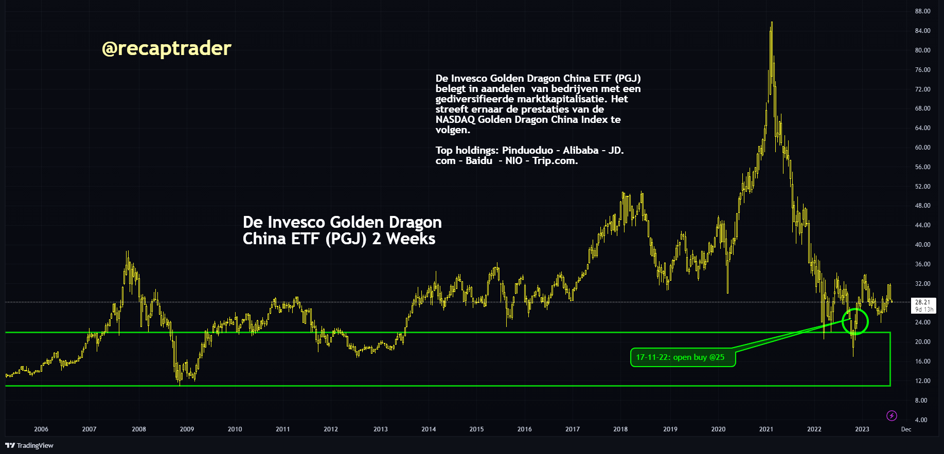 We zitten op een aantal instrumenten long op China. Deze staan nog steeds niet in verlies, maar de winsten zijn uit handen gegeven. Er is wel verlies op de long van Alibaba $BABA die we toch blijven aanhouden vanwege de opsplitsing. De andere posities zouden we rond break-even een stop inleggen en dan afwachten. We zijn nu onzeker, maar weten ook dat alles zo weer kan veranderen.