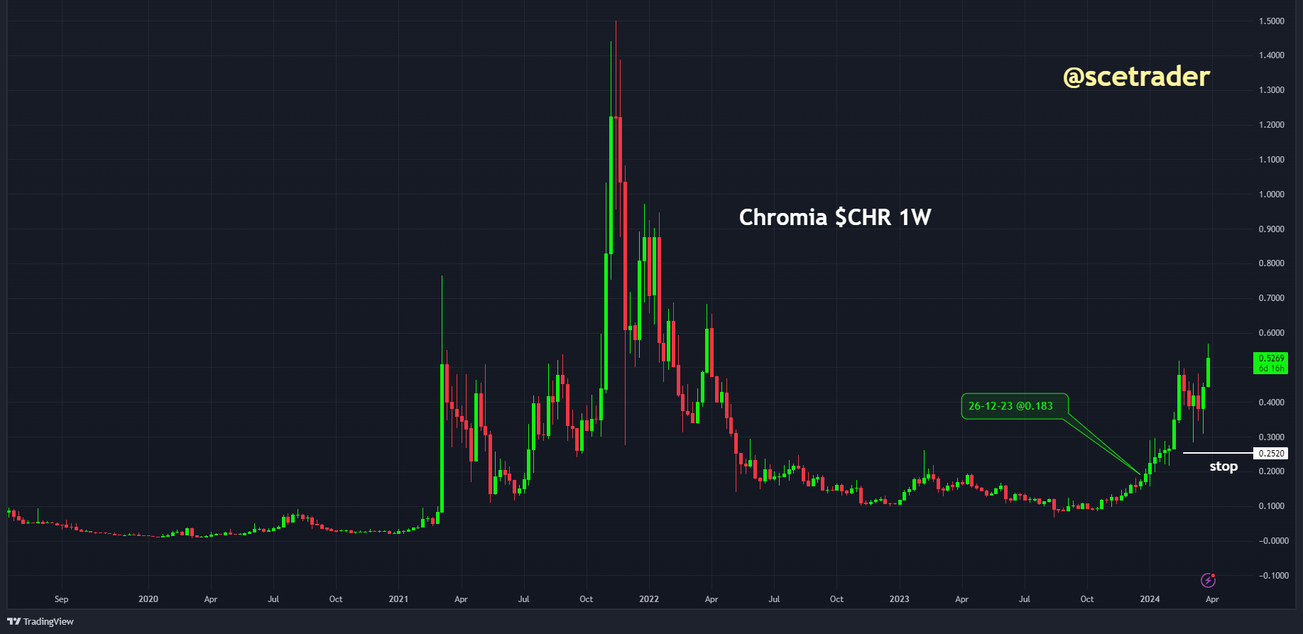 Later dit jaar zal het mainnet van Chromia live gaan. Dit is ook de reden waarom we vanaf ongeveer 18 cent op een stijging zitten. Het is nog onduidelijk of de huidige stijging zal aanhouden. Hoewel Chromia een sterk protocol heeft, richt het zich momenteel te veel op gaming. Dit zal moeten veranderen en het moet zich meer gaan richten op serieuze toepassingen. Desalniettemin blijven we momenteel op een up.