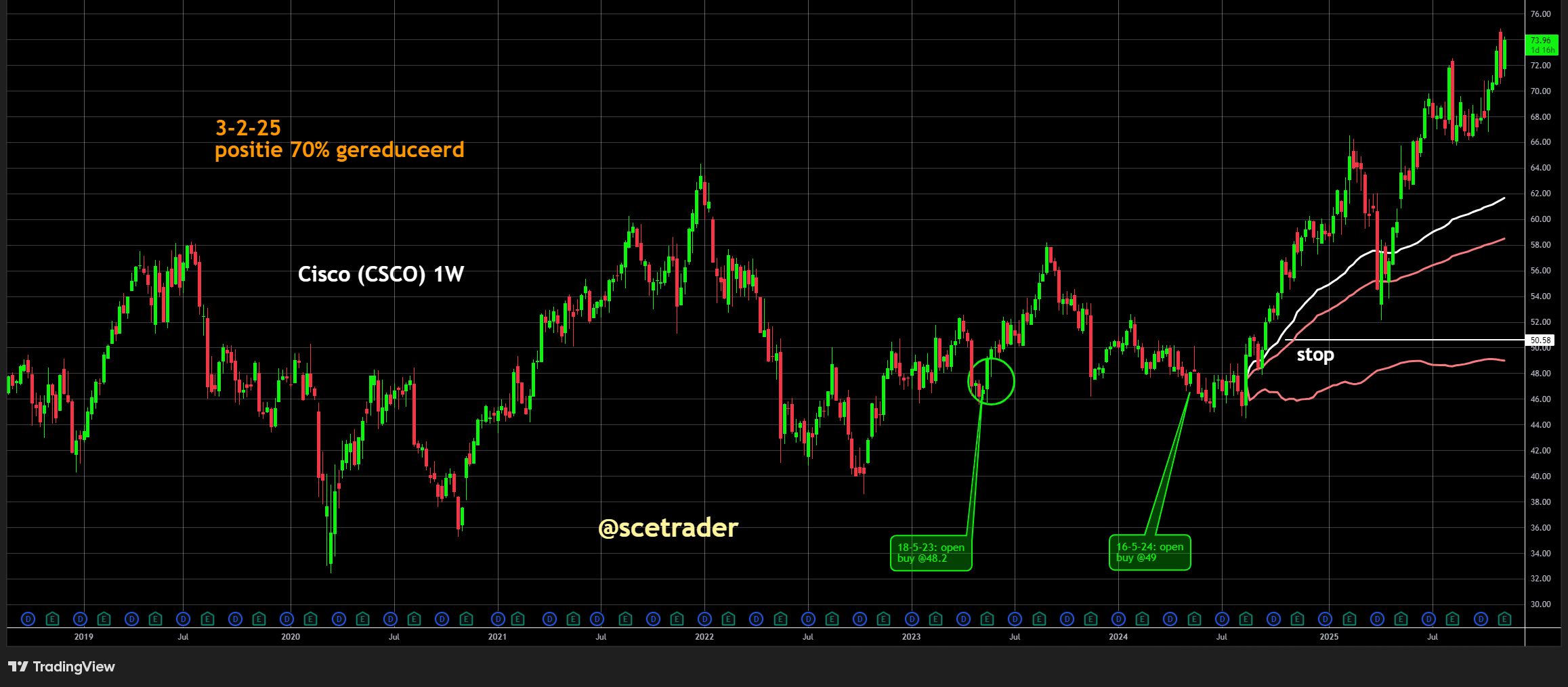 Per saldo bevestigen de resultaten en de outlook dat Cisco’s herpositionering werkt. Het bedrijf koppelt winstgevendheid aan technologische relevantie en laat zien dat het niet afhankelijk is van één marktcyclus. Vanuit onze instap rond 48,20 en 49 dollar blijven we op een stijging zitten. De free-ride-positie laat ons optimaal meedraaien met de structurele opwaartse trend, zonder het kapitaalrisico verder te vergroten.