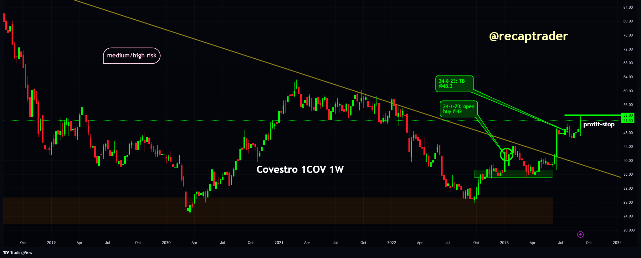 We hebben niet alleen eerder geschreven over de kansen van deze overname, maar zitten ook al op een stijging. De eerste opwaartse rating dateert vanaf januari. Zoals eerder geschreven, zouden we een winststop instellen op 53 euro zodra dit niveau wordt overschreden. Dit kunnen we nu verhogen naar 58 euro, gezien het overnamebod van ongeveer 60 euro.