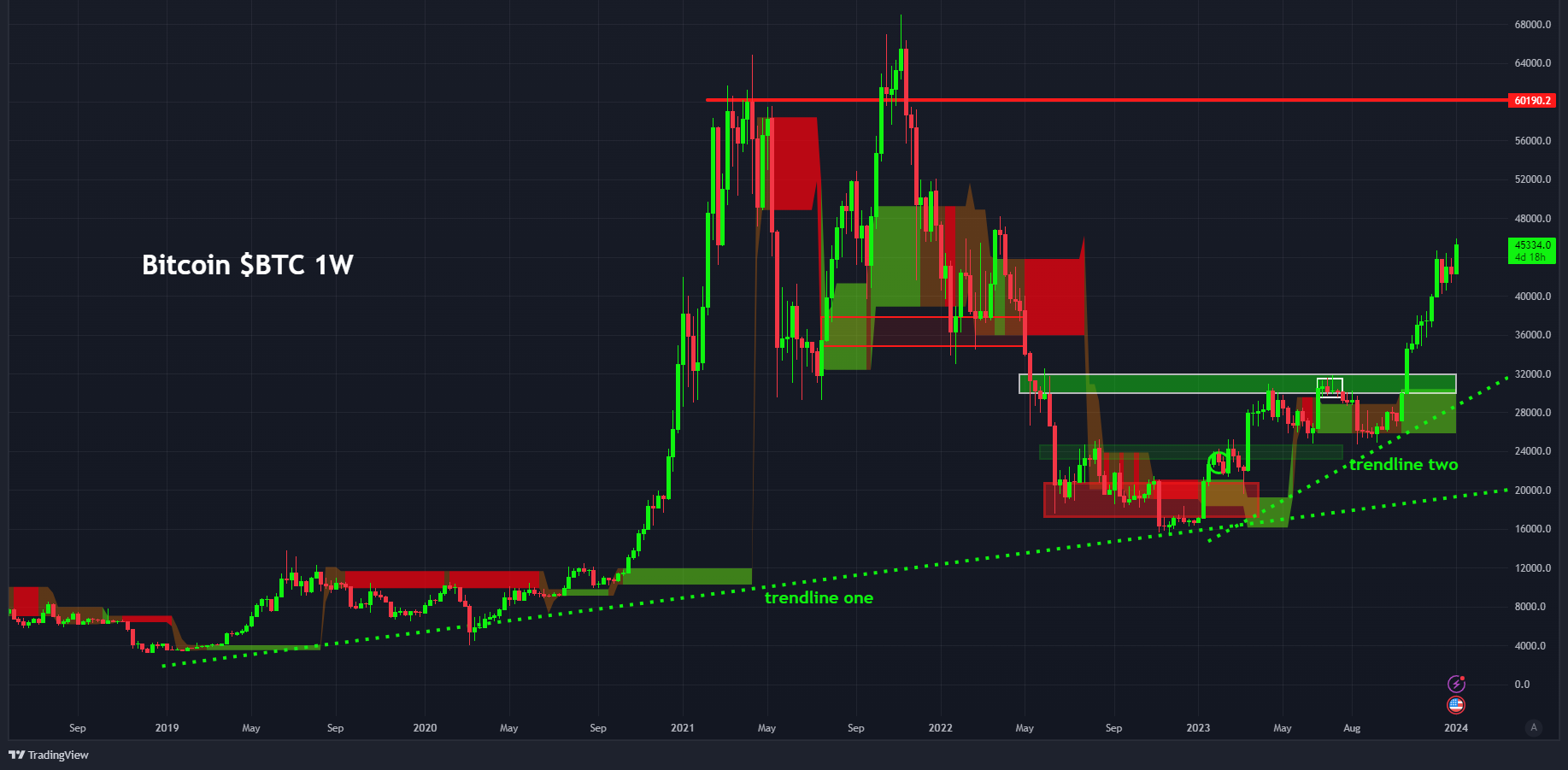 Wat betreft Bitcoin zitten we nog steeds in een opwaartse beweging, maar het is best mogelijk dat er een tijdelijke "sell the news" komt op de aankondiging door de SEC van spot Bitcoin ETF's. Dit zou dan mogelijk net daarna zijn. Ook de kans dat er een iets overdreven renteoptimisme is, kan tijdelijk negatief zijn.