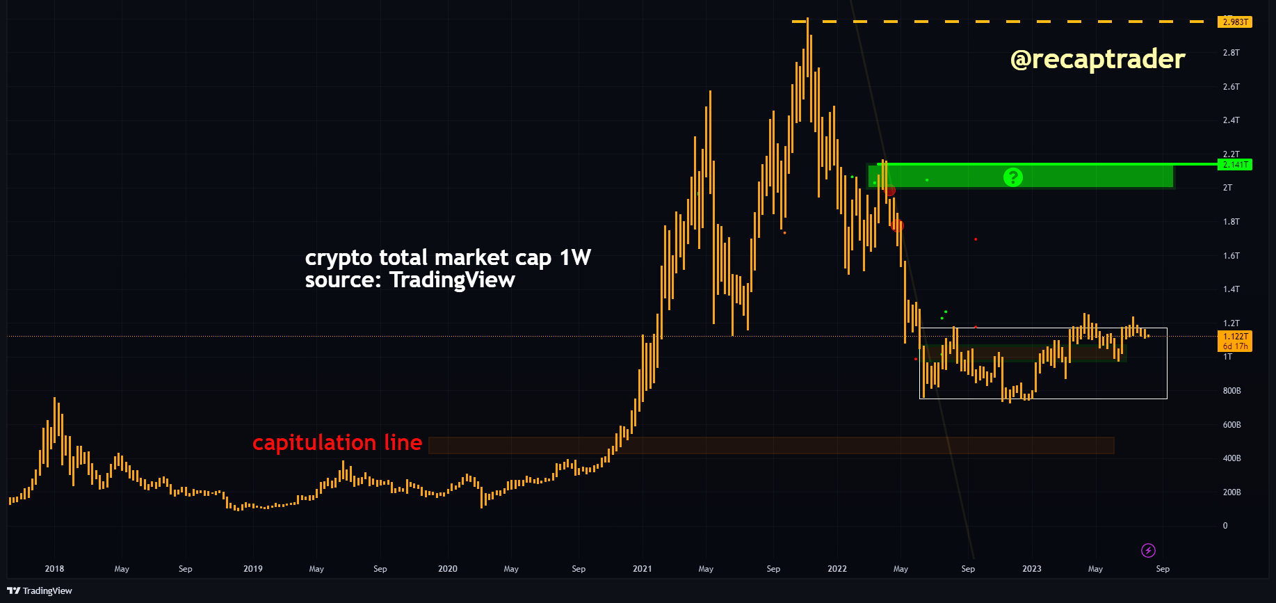 Tot nu toe vandaag maakt crypto nog geen aanstalten om een echte richting te kiezen. Het wordt "saai", maar de totale markt blijft in de range sinds juni vorig jaar.
