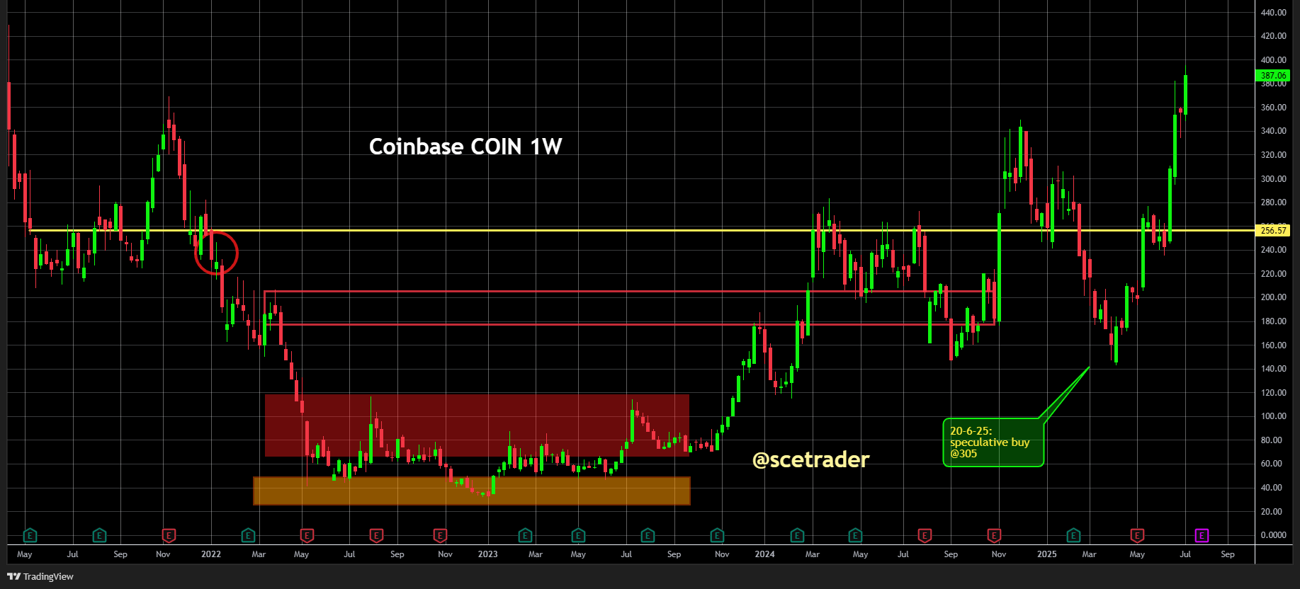 Hoewel Coinbase niet onze favoriete beurs is binnen de exchange-sector (wij geven de voorkeur aan Deutsche Börse, zie de database, vanwege bredere activiteiten), hebben we op 20 juni een speculatieve positie genomen op $305. Zie ook de databse.