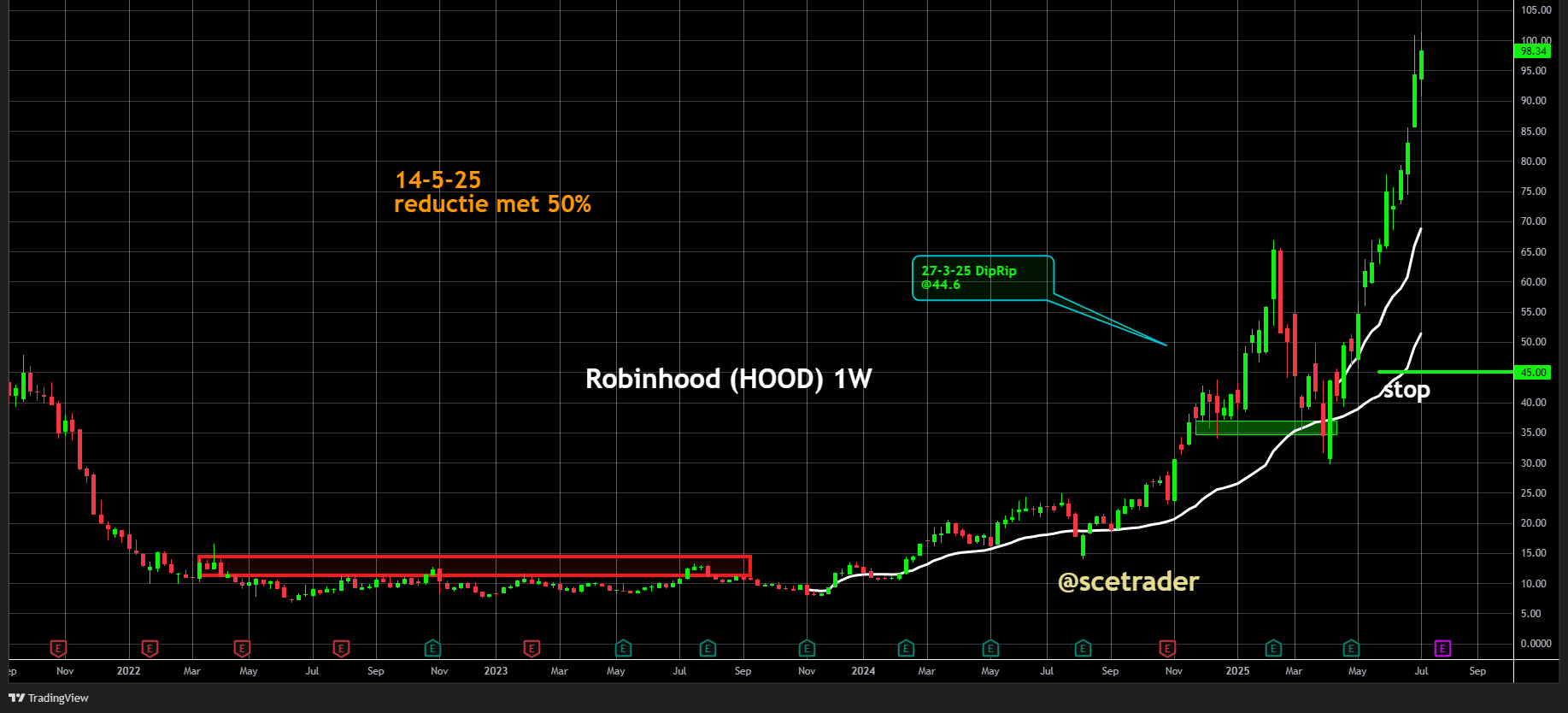 We zijn ons bewust van de lange termijnrisico’s, vooral als de markt tegenzit of als regelgeving strenger wordt. Toch blijven we zitten zolang de trend positief blijft. Een aanpassing van de stop-loss naar boven ligt voor de hand.