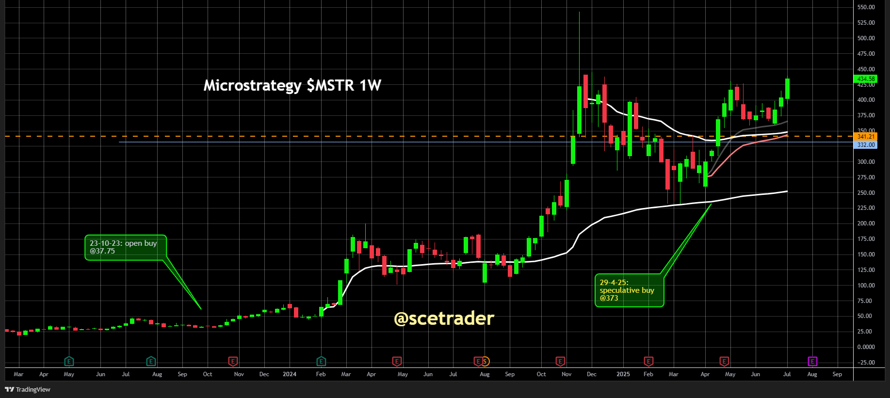 We namen op 29 april een longpositie in op $373, mede op basis van een positief patroon op de VWAP's. Ondanks dat het aandeel relatief achterblijft bij de stijging van Bitcoin, geloven we dat bij verdere opwaartse bewegingen van Bitcoin de hefboomwerking weer terugkeert. Zie ook de database.