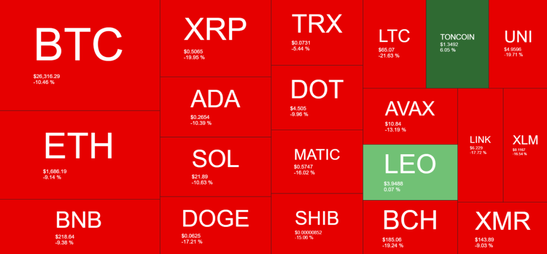 De heatmap voor crypto over de afgelopen 7 dagen laat voornamelijk rode kleuren zien. Bitcoin heeft meer dan 10% van zijn waarde verloren. En Ethereum, waarbij we nog steeds niet uitsluiten dat het daalt tot 700 dollar, is 9% lager.
