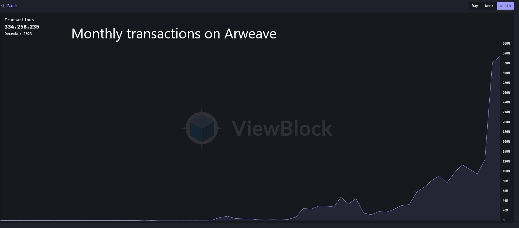 Arweave is een opslagprotocol en heeft zijn sporen reeds verdiend. Bij meer activiteit ontstaat ook daadwerkelijk een hogere vraag, en zoals zichtbaar in de grafiek, is deze vraag constant aan het toenemen.
