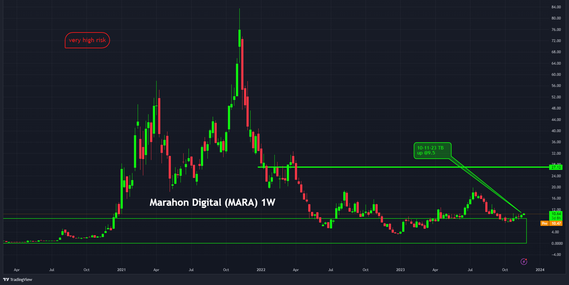 Marathon $MARA blijft nog relatief achter, maar als de miner de trend van het laatste kwartaal kan voortzetten ligt hier zeker nog steeds een high-risk kans.