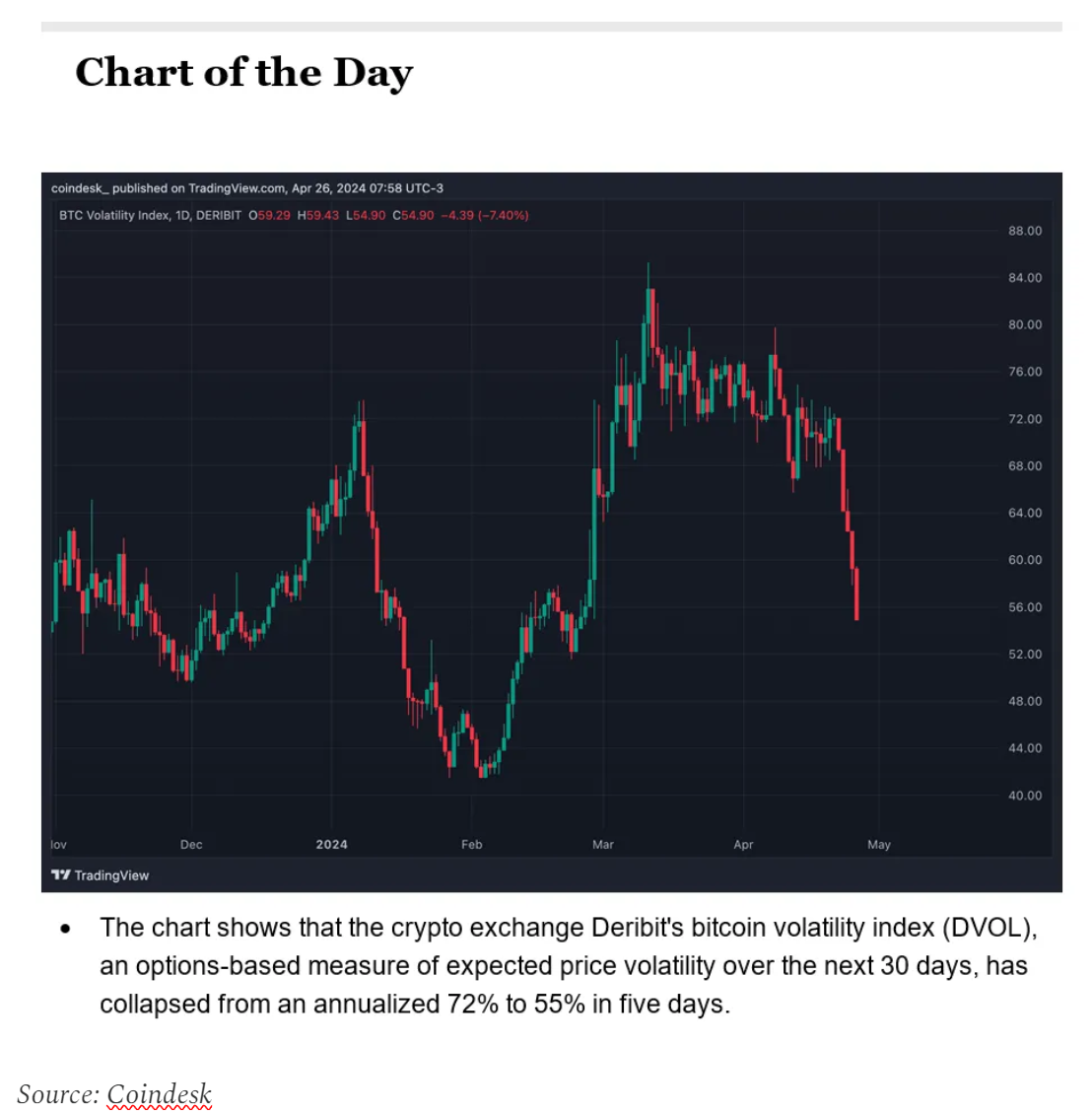 Een wat choppy week in digital assets ondanks alle (tech) bedrijfscijfers en macro-economische data vanuit de US. Volume was laag en ook de implied volatility neemt behoorlijk af (zie grafiek).